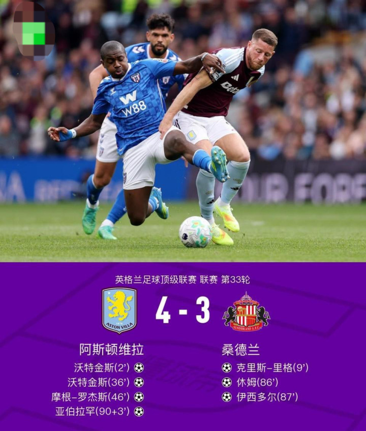 昨日(4月19日),英超第33轮迎来一场足以载入本赛季经典史册的进球大战!阿斯顿维拉坐镇维拉公园球场,迎战状态回暖的桑德兰,全场7粒进球轮番上演,反转、反超、扳平、绝杀,每一分钟都让人肾上腺素飙升,最终维拉以4-3的比分绝杀对手,惊险拿下关键3分,延续4轮不败的强势势头,稳稳守住英超第4的位置,向欧冠资格发起冲击;而桑德兰则在最后时刻功亏一篑,从3-3扳平到被绝杀,到手的1分化为泡影,留下无尽遗憾。